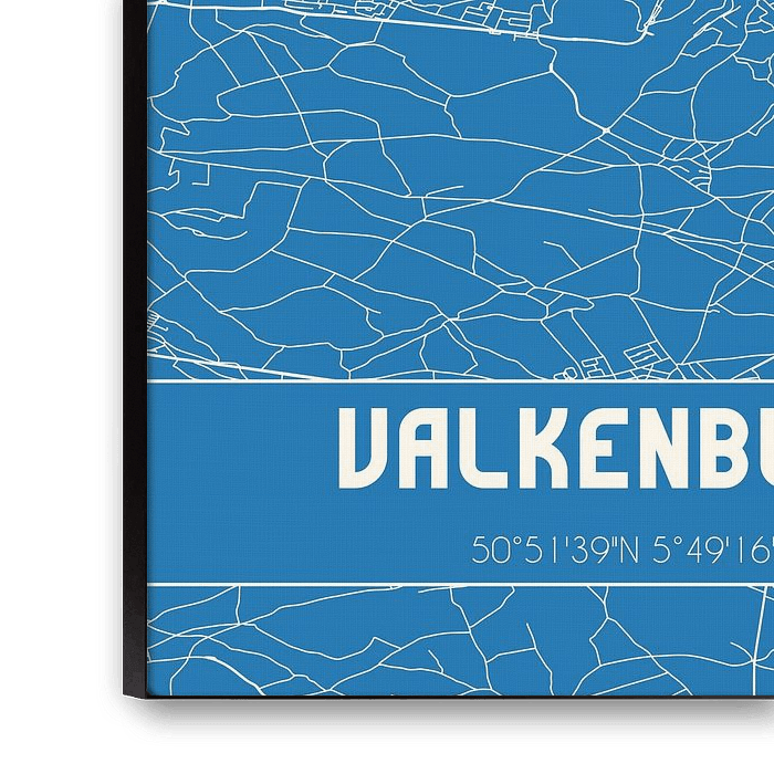 Blueprint of the map / map of the Dutch town Valkenburg, located in municipality ValkenburgaandeGeul, province of Limburg. The map includes all public roads and the coordinates of the center of Valkenburg.