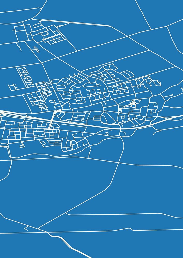Blueprint of the map / map of the Dutch town Vlijmen, located in municipality Heusden, province of North Brabant. The map contains all public roads and the coordinates of the center of Vlijmen.