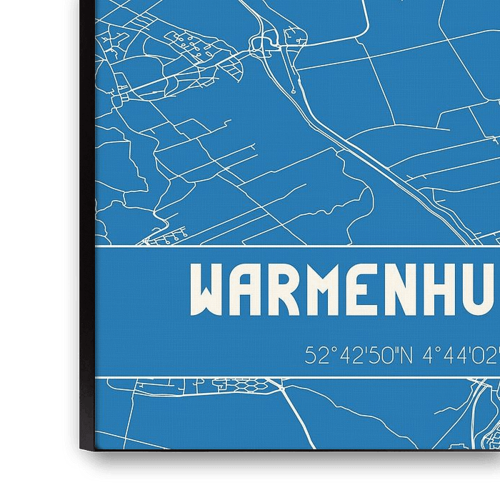 Blueprint of the map / map of the Dutch town of Warmenhuizen, located in municipality of Schagen, province of North Holland. The map includes all public roads and the coordinates of the center of Warmenhuizen.