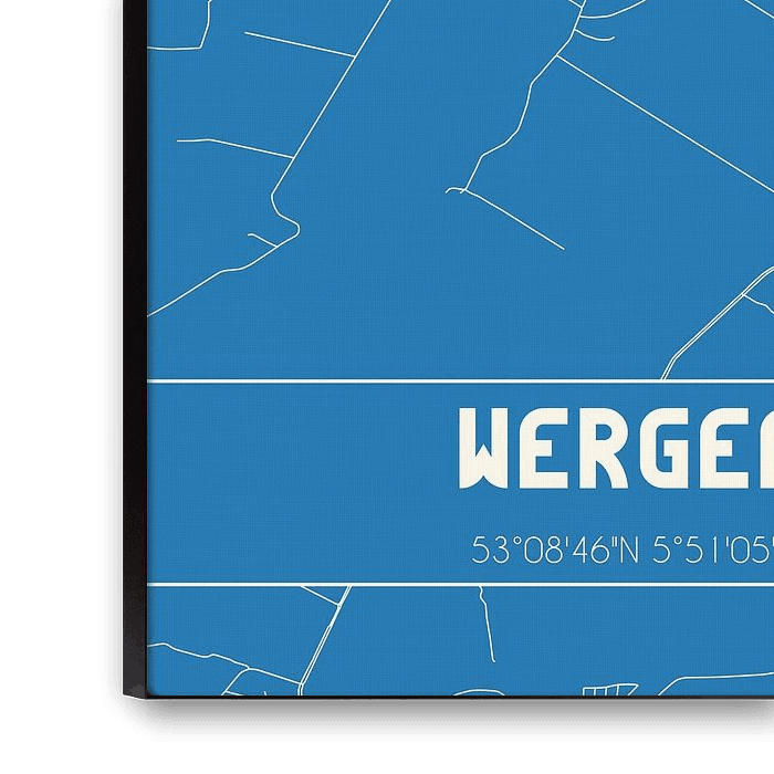 Blueprint of the map / map of the Dutch town Wergea, located in municipality Leeuwarden, province Fryslan. The map includes all public roads and the coordinates of the center of Wergea.