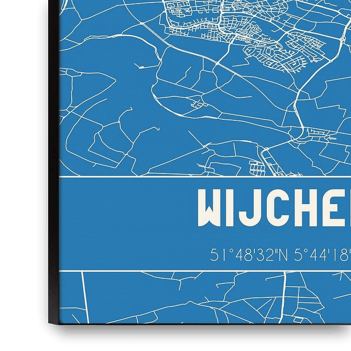 Blueprint of the map / map of the Dutch town Wijchen, located in region Rivierenland, in municipality Wijchen, province Gelderland. The map includes all public roads and the coordinates of the center of Wijchen.