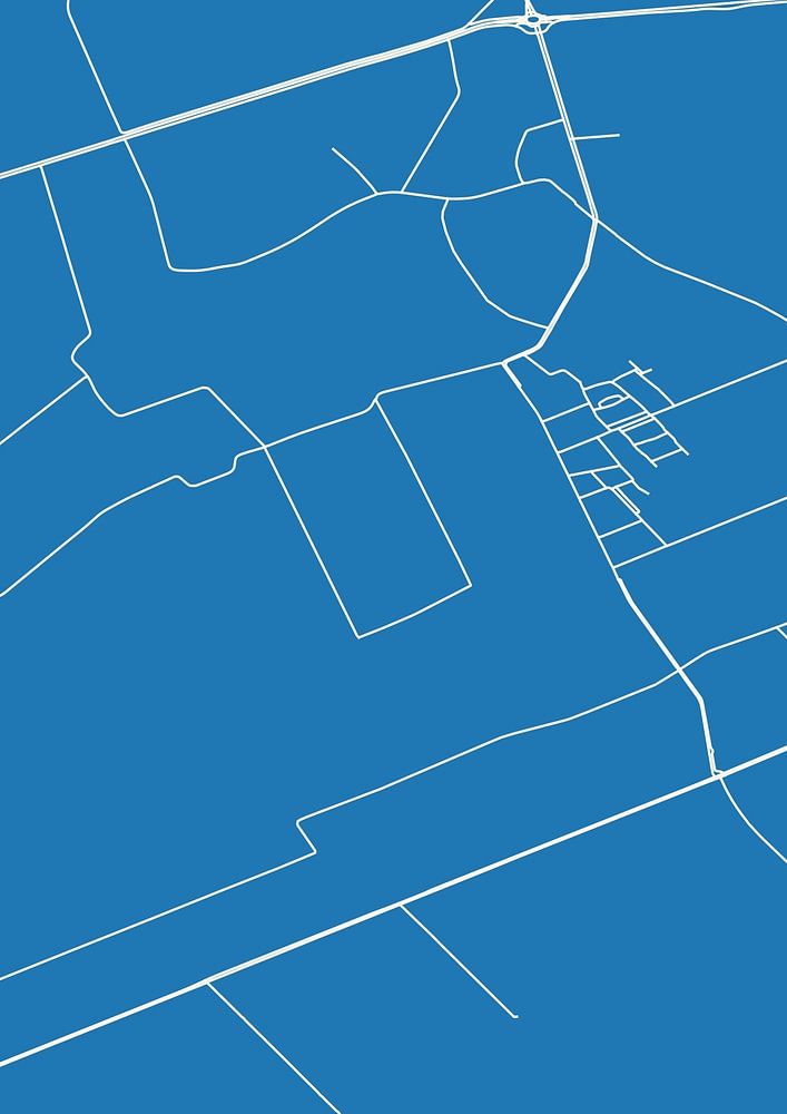 Blueprint of the map / map of the Dutch town Wilbertoord, located in municipality MillenSintHubert, province of North Brabant. The map contains all public roads and the coordinates of the center of Wilbertoord.