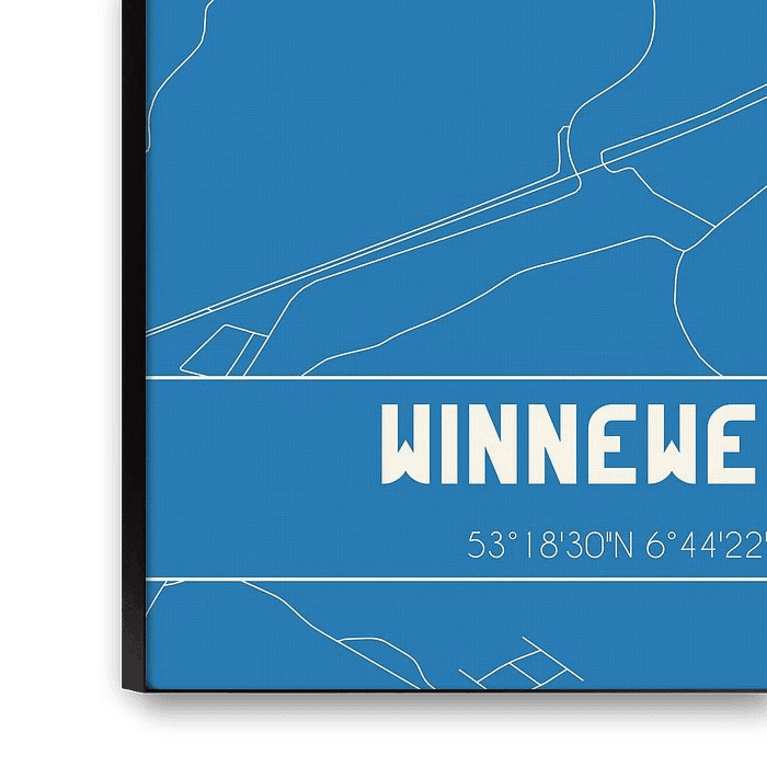 Blueprint of the map / map of the Dutch town Winneweer, located in municipality of Groningen, province of Groningen. The map contains all public roads and the coordinates of the center of Winneweer.