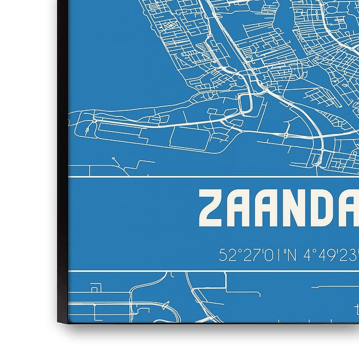 Blueprint of the map / map of the Dutch town Zaandam, located in the Randstad, in municipality Zaanstad, province of North Holland. The map includes all public roads and the coordinates of the center of Zaandam.
