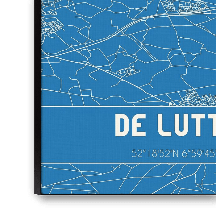 Blueprint of the map / map of the Dutch town de Lutte, located in Twente, in municipality Losser, province of Overijssel. The map contains all public roads and the coordinates of the center of de Lutte.