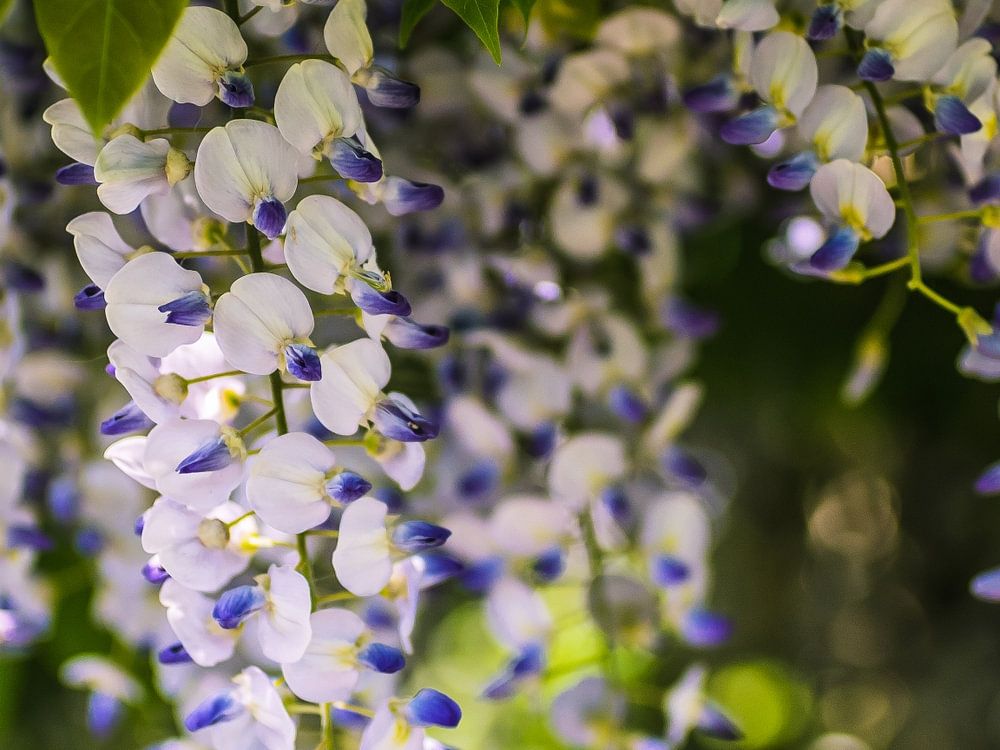 the branches are woven around the fence of the Wisteria, beautiful how full it is with flowers.