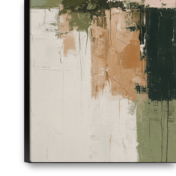 A modern abstract artwork in which soft pastel hues harmoniously blend with bold green accents. The composition displays a subtle balance between geometric planes and organic botanical elements, with a delicate pink flower floating against a backdrop of mint, sage, and terracotta. The textured brushstrokes create depth and movement in…