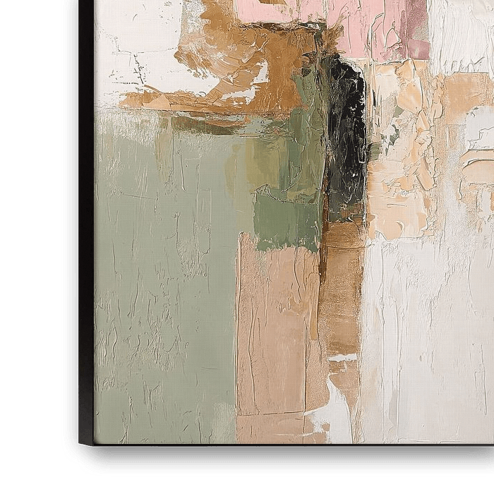 A soothing abstract artwork in which soft pink tones blend harmoniously with subtle green and beige accents. The textured brushstrokes create an organic composition with a calm, almost meditative quality. The various color planes are delicately interwoven, resulting in an atmospheric whole that fits perfectly into a modern interior.