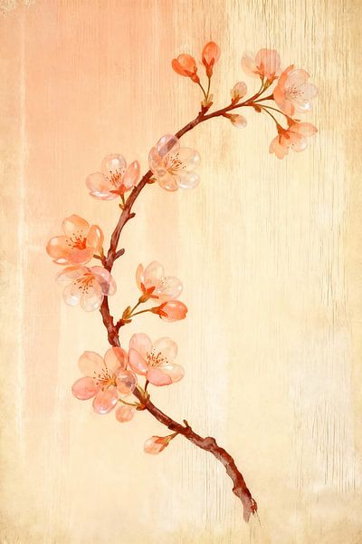 A single, graceful branch arcs across the canvas, dotted with delicate blossoms in soft shades of peach, blush pink and warm cream. Each flower is rendered with translucent petals, as if made of glass catching the first light of morning. Tiny stamens radiate from the centers, adding quiet detail and drawing the eye along the curve of…