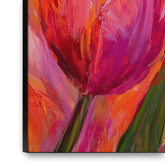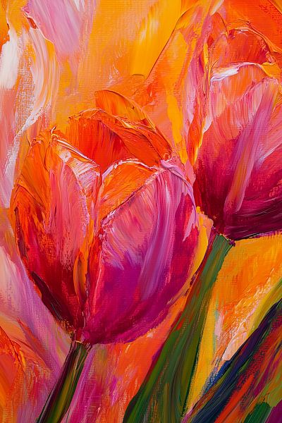 In Blushing in the Sun, tulips unfold like warm breath in the first full light of spring. Their petals bear shades of carmine, rose red and soft orange, as if they have just been touched by a golden morning. The sunlight glides over the paint like a caress and catches in the thick brushstrokes, where shine and shadow…