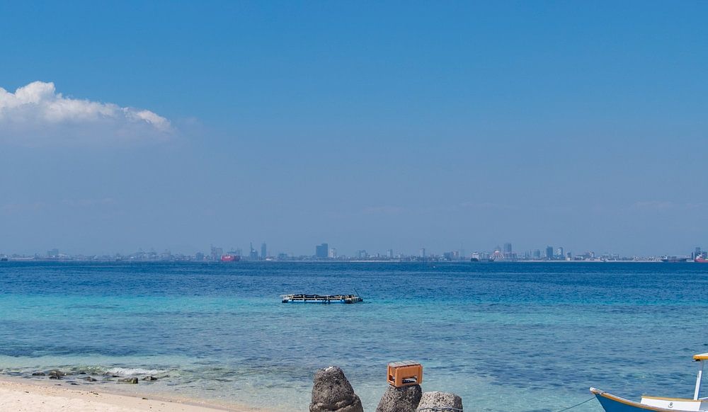 A boat moors on a tropical beach of a tiny island. In the background, the big city of Makassar on Sulawesi, Indonesia.