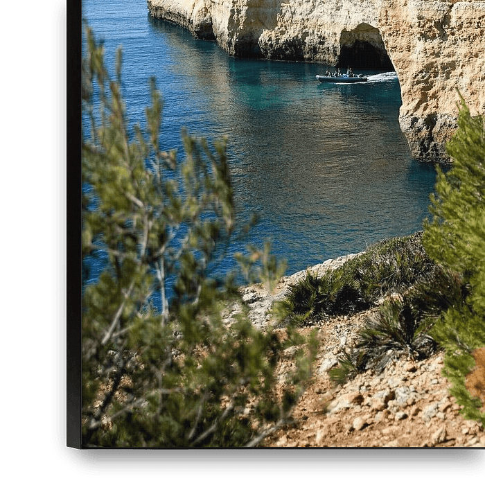 A boat leaves a cave along the Algarve coast as the evening light warmly colours the rocks. A hushed and narrative moment that adds calm and depth to a space.