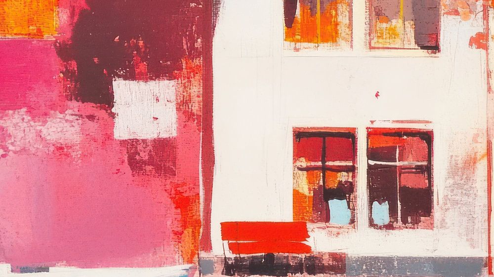 Colourful painting of a boat on an Amsterdam canal. The style is reminiscent of Mark Rothko. The work is a colourful statement on the wall. also, the work is a timeless, calming artwork that exudes a sense of minimalism, nature and balance.