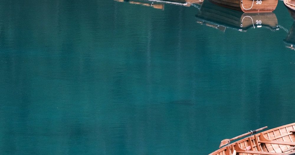 Close up of the boats on the Braies Lake ( Pragser Wildsee ) in Dolomites mountains, Sudtirol, Italy. Lago di Braies, Italian Alps.