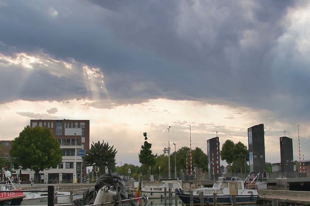In the foreground, a boat lying in the marina in the Limburg town of Weert.