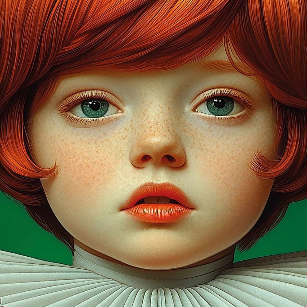 Her red hair glows like a flame in the darkness. Her eyes, full of mystery, gaze across time and space. The collar, an echo from centuries gone by, makes her image even more dreamy. A child of the past, a soul of the present.