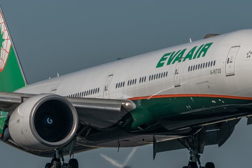 About "Boeing 777-300 of the Taiwanese airline EVA AIR just before landing on Schiphol's Polder Runway"