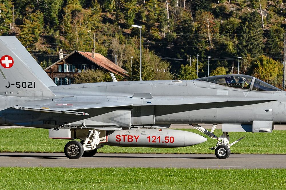 Boeing F/A-18C Hornet of the Swiss Air Force. A Boeing F/A-18C Hornet of the Swiss Air Force landed at Meiringen airbase. This photo was taken on 11 October 2017 during the Fliegerschiessen organised annually by the Swiss Air Force at the shooting range located at an altitude of 2,200 metres near the mountain village of Axalp. This event is open to the public and is attended by several thousand spectators.