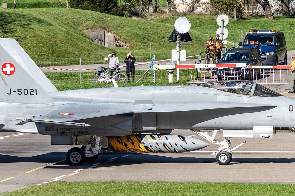A Boeing F/A-18C Hornet of Fliegerstaffel 11 of the Swiss Air Force has landed at its home base in Meiringen.