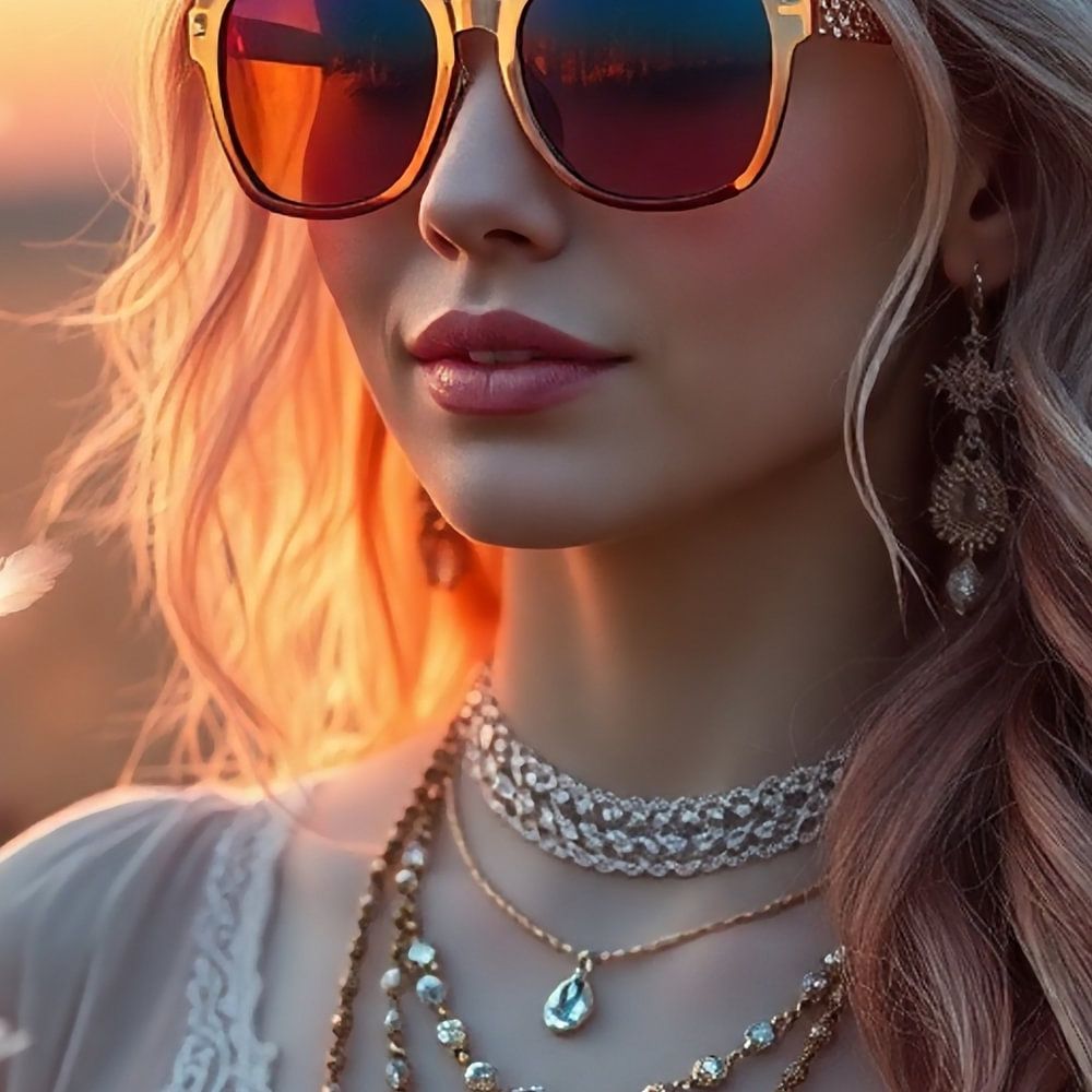 This work of art exudes bohemian elegance and luxury, featuring a woman clad in gold glasses adorned with sparkling diamonds as jewellery. Surrounded by a lush field of flowers, she creates a dreamy, sophisticated and artistic look, perfect for an interior that embraces natural beauty and glamorous boho style.