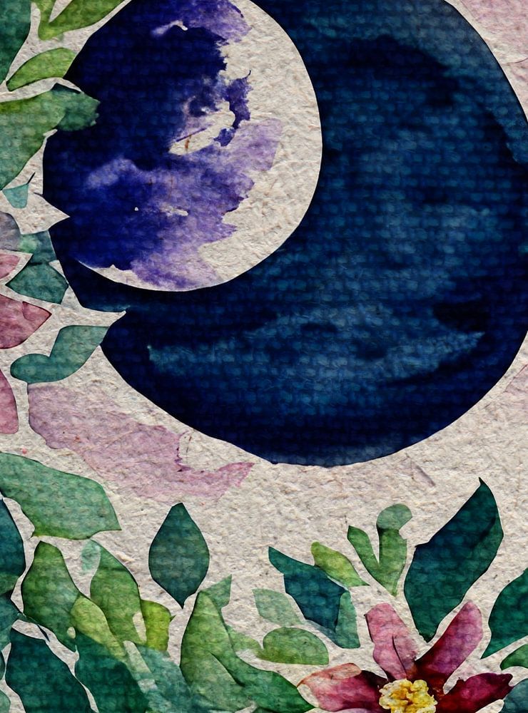 Bohemian Vintage watercolour of the moon surrounded by garlands of flowers in a deep dark night, with a dark blue, purple sky. The moon is surrounded by stars and flowers.
