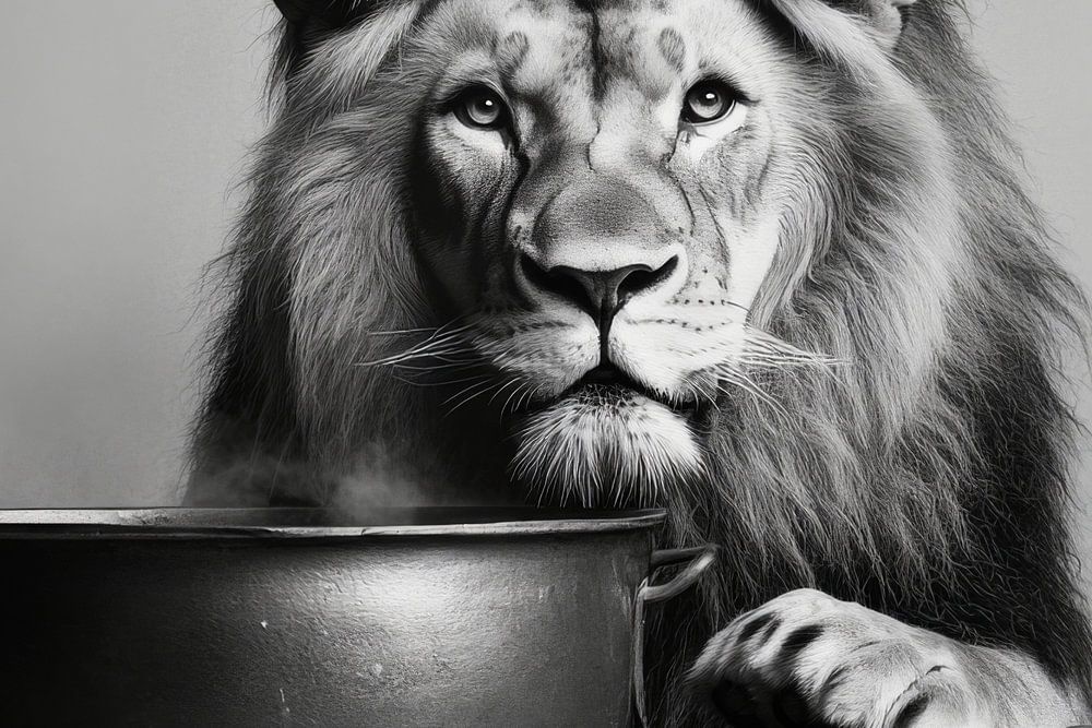 A majestic lion patiently watching over a steaming cauldron exudes a mesmerising blend of strength and serenity. The stylish black and white aesthetic emphasises the fine details and adds a touch of elegance to the scene. Perfect for the modern kitchen, this work of art creates an exceptional atmosphere when cooking.
