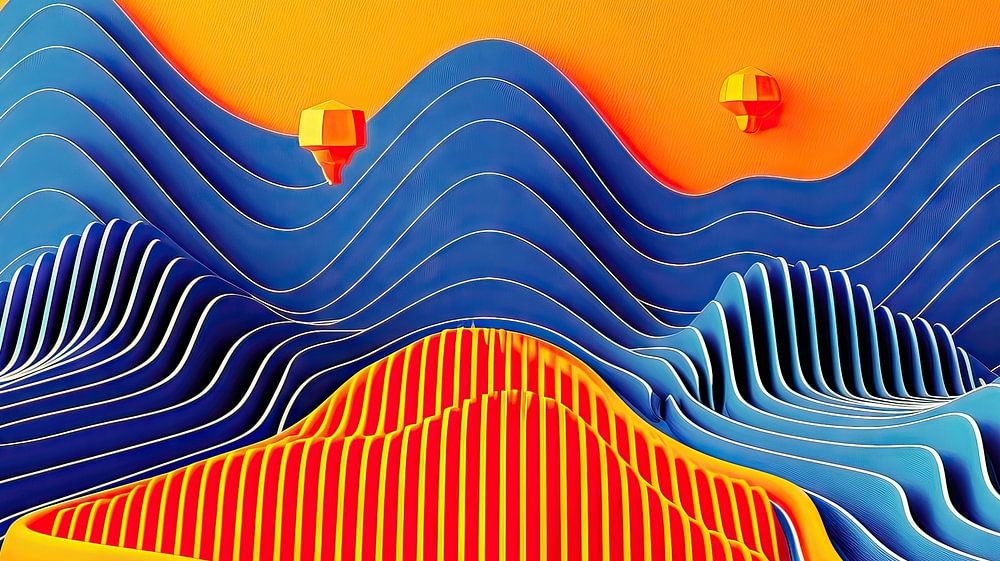 This bold 3D illustration shows stylised waves in blue with orange and red accents. The waves have a striking presence and add depth and dynamism to the scene. The vibrant colours and distinct stylisation of the waves create a striking visual impact. This illustration captures the power and beauty of ocean waves and presents them in a creative and bold 3D interpretation. It invites the viewer to be inspired by the striking beauty and innovative design of this artistic rendering.
