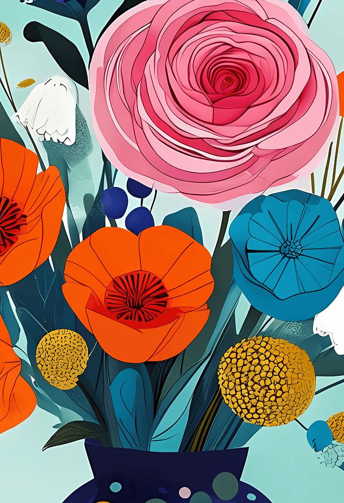 This design features a vibrant and stylized floral arrangement in a dark blue vase against a soft, light blue-green background. The flowers are depicted in a simplified, almost illustrative manner with bold colors and rounded shapes. Dominant are the large, orange poppy-like flowers with black centers and textured petals, a large pink bloom with layers of concentric circles, and clusters of smaller yellow and blue blossoms. White accents add highlights and depth. The vase, decorated with orange and yellow circles, provides a strong contrast to the lighter backdrop and ties the color scheme together. The overall feel is cheerful, modern, and slightly abstract.