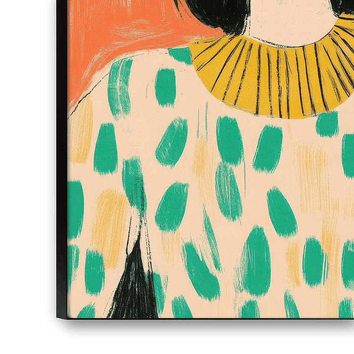 A stylised illustration of a woman in the head and upper body area, rendered in a bold, graphic style with thick brushstrokes. The woman wears black sunglasses, has short, dark hair in a bob cut and red lips, which form a strong contrast to her light complexion. Her top is cream-coloured with abstract green and turquoise patterns, while a yellow collar provides a decorative accent. The background in strong orange emphasises the figure and reinforces the modern, expressive look of the illustration. The composition is minimalist and graphic, with thick lines and bright colours that bring the motif to the fore.
