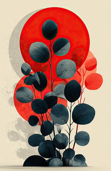 Bold Leaf Against Red Background - This is a botanical painting depicting a group of leaves, contrasting sharply against a large, bright red circle, giving the scene a modern and fresh look.