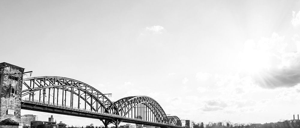 Bollard meadows in Cologne with south bridge and Rhine in black and white