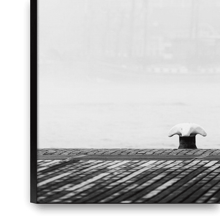 Beautiful photo of a bollard on the Meuse for Hotel New York in mist. You see outlines of the old ships across the street.