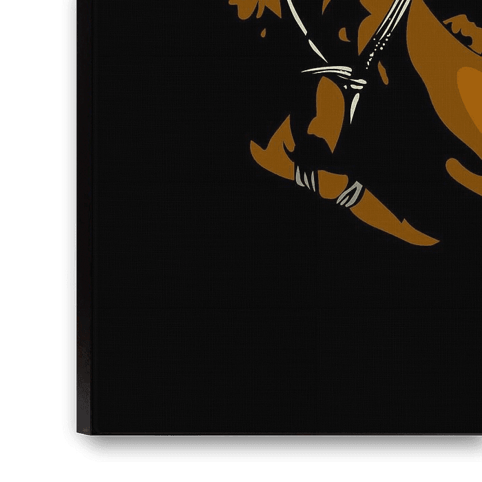 The picture shows a stylised, graphically reduced depiction of a female body held in the air by a complex rope pattern. The colour scheme is rich in contrast: warm orange tones of the figure stand in stark contrast to the deep black background, while the ropes are depicted in shades of white and grey. This clear separation of colours emphasises the structure and lines of the composition.