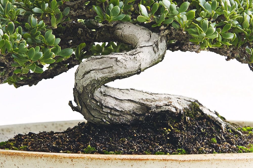 This beautiful bonsai tree brings a touch of nature to any room and exudes a serene and minimalist look. The small, detailed tree with an ornately twisted trunk is presented in a simple, white pot that balances it harmoniously. Perfect for a quiet workplace, a modern living room or as a focal point in an office. The green leaves and artistic design of the bonsai create a relaxing atmosphere and add a subtle touch of Japanese aesthetics to your interior.