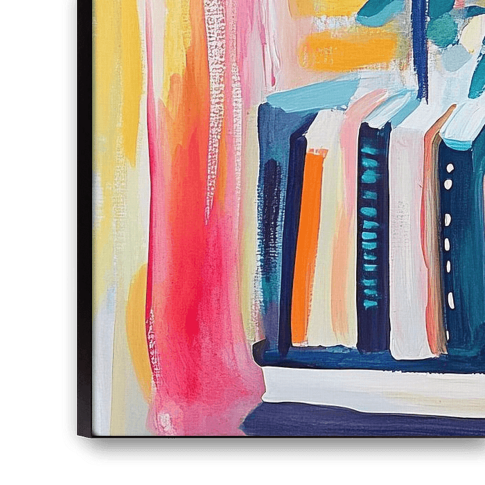 Books and Plant | Plant and Books in Light Space - This painting shows a cheerful combination of a plant in a vase with colourful leaves, several books in various colours, and beautiful natural light falling through a window, giving the painting a fresh and positive atmosphere.