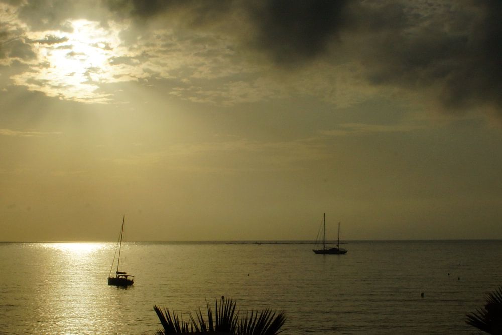 zonsopgang met bootjes op de voorgrond palmplanten.