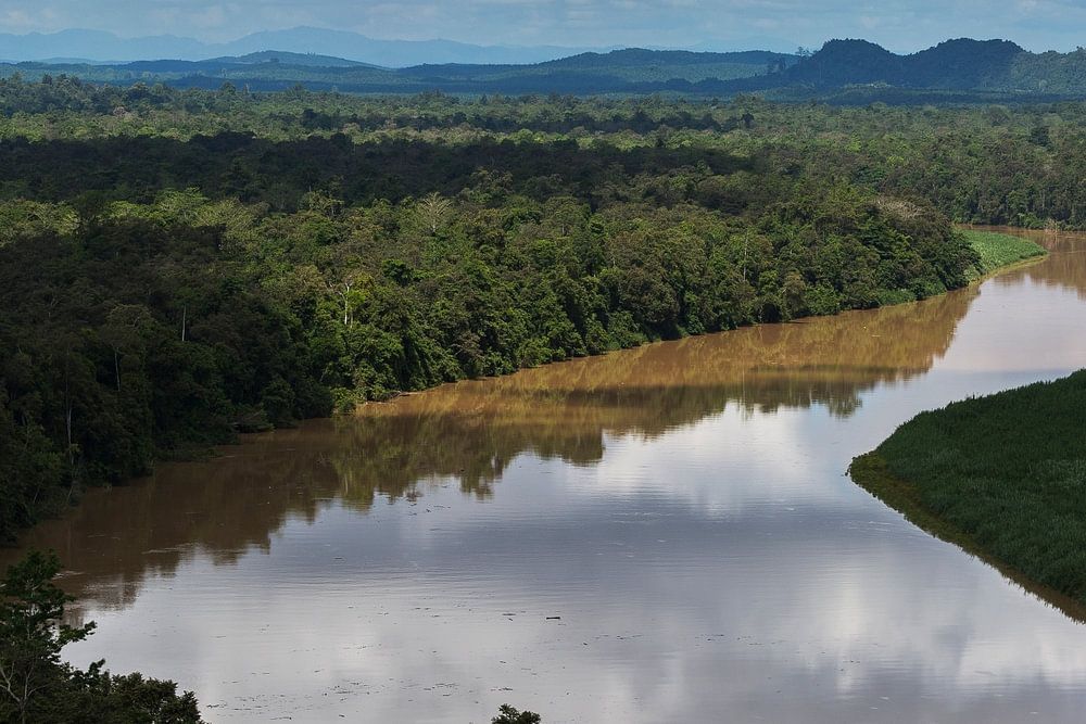 This picture was taken in Borneo and shows how nature used to look with the tropical rainforests and the meandering rivers. Nowadays much of the original rainforest has been cut down and many palm plantations are planted. The green surroundings contrast beautifully with the cloudy blue sky and the reflecting water.