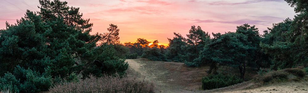 Panorama during a beautiful sunrise at nature reserve 'Boshuizerbergen' (Venray, Netherlands). This is a panorama of 5 single shots and shows all the characteristics of nature reserve 'Boshuizerbergen': forest, shifting sand(dunes), juniper thickets, heather and then there is also the railway line between Venlo and Nijmegen.
