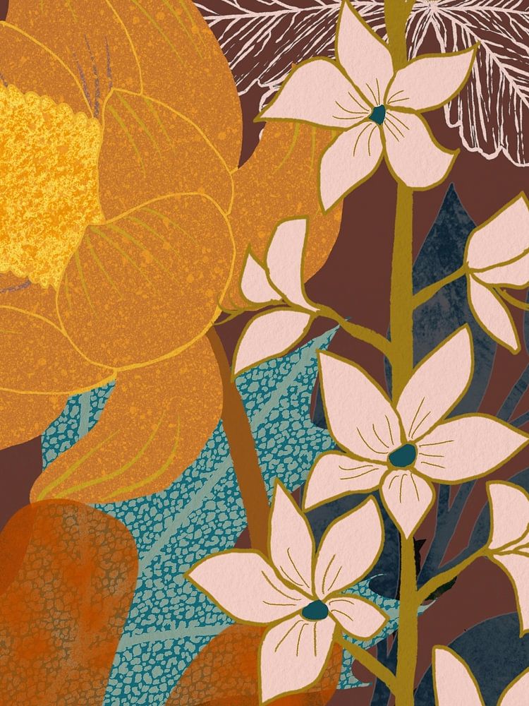 Series of floral portraits with powerful colours and large, clear shapes. Subtle accents bring balance between tranquillity and energy. Digital work, drawn by hand — without the use of A.I. These floral portraits are composed of powerful colours and large, distinct shapes. The interplay of scale and composition makes them feel…