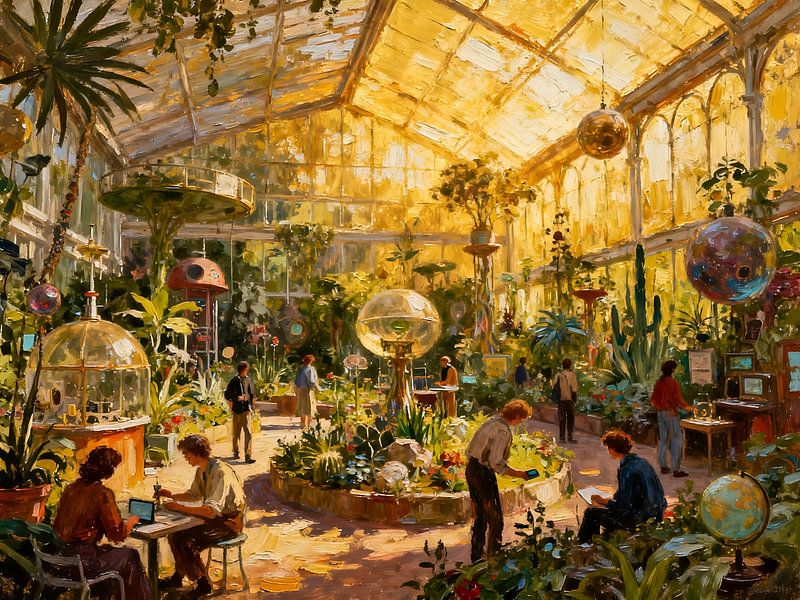 This detailed artwork depicts a fascinating blend of botanical garden and futuristic research laboratory. In a large glass structure filled with plants, people work among exotic flora, technical equipment and experimental installations. The scene combines nature, science and innovation in a harmonious composition.
