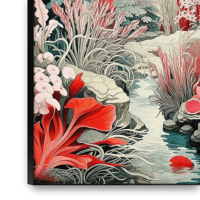 Illustration of a botanical garden with various plants and flowers, done in a style with light red and light emerald green tones. It shows a hyper-realistic depiction of garden life.