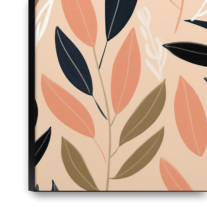 Botanical Pattern - The canvas presents a lovely pattern of stylised leaves in a calming arrangement, with the 'Peach Fuzz'undertone creating a warm and inviting atmosphere. The leaves vary in shape and colour, from deep navy and olive green to softer terracotta and beige tones, creating a harmonious feel suitable for a…