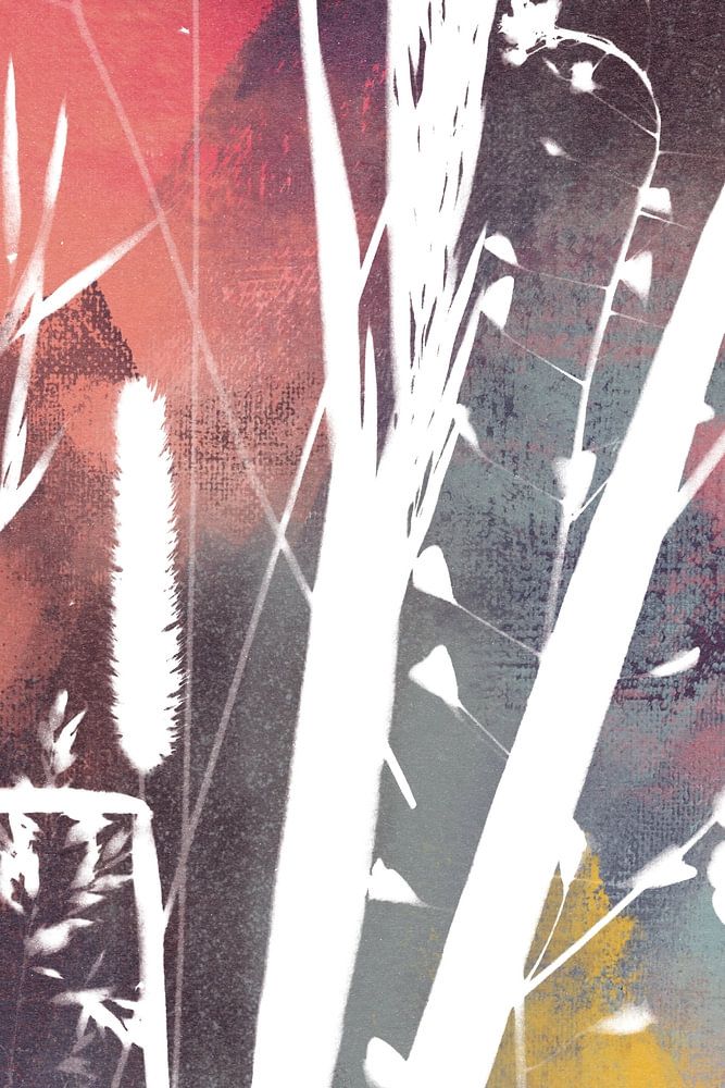 About "Botanical print, cyanotype, combined with a colourful abstract background"