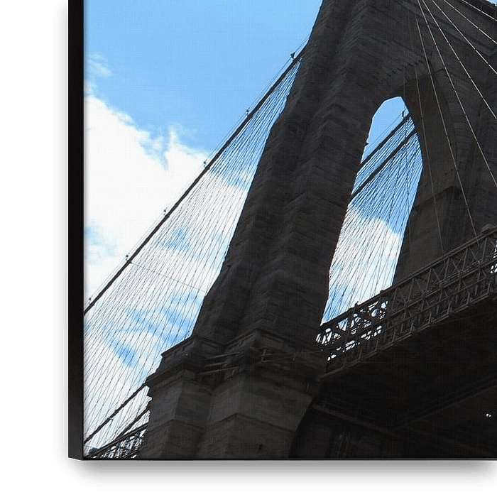 A photo of the bottom view of the Brooklyn Bridge in New York with a beautiful blue sky in the background. The Brooklyn Bridge is located in the United States and connects Manhattan and Brooklyn.