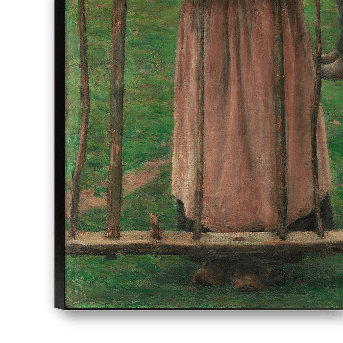 "Boudeuse" or "Amuada" is the representation of a young woman resting on a gate. The figure’s body faces the viewer but her face is turning to the right. In the background a boy leans against a trunk with his cross-armed.