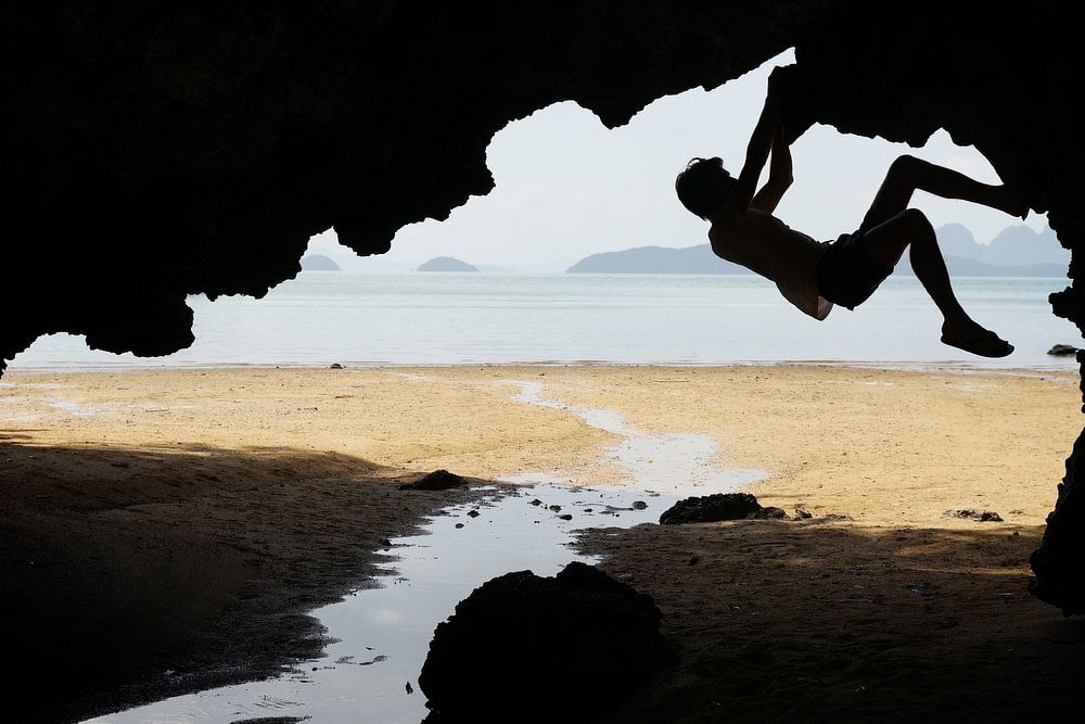 Buy this landscape artwork Bouldering in a cave by Floris Verweij on canvas, ArtFrame, poster and wallpaper, printed on demand in high quality.