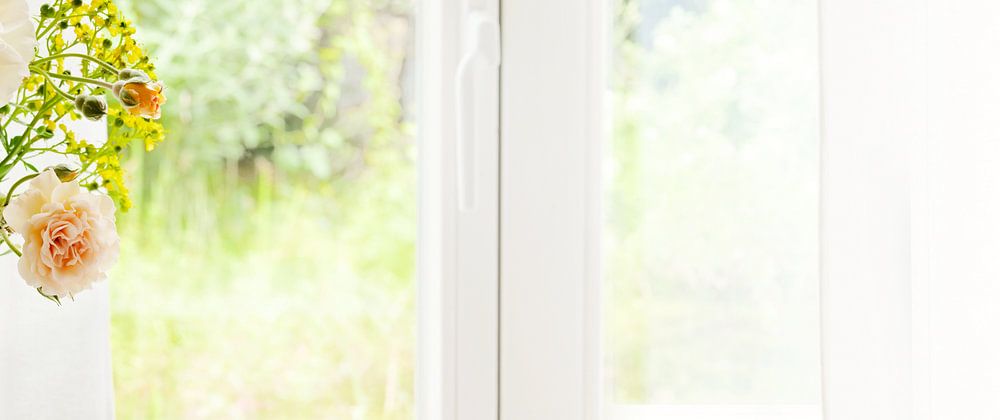 Bouquet from orange roses and rue in glass vase at the window in front of a white curtain, panoramic by Maren Winter