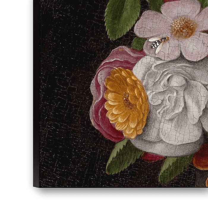 Small insects are depicted on the flowers and leaves, which is a characteristic detail of still lifes from this period. You will not encounter these insects in the original painting, I have added them digitally.