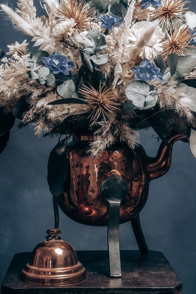 Bouquet of Dried Flowers as Still Life in a Copper Kettle