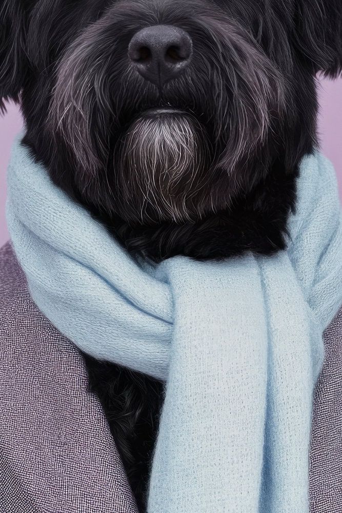 A charming Bouvier des Flandres shines in his elegant suit and soft, blue tubular scarf combination. His striking, shaggy coat and expressive eyes lend him a mischievous intelligence. With a touch of superiority and a little twinkle in his eye, he is the epitome of stylish canine elegance.